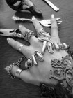 Während ich Farbe auf dem Papier auftrage, trage ich die Farben meiner inneren Stimmung mit Kleidung und Körperschmuck nach außen – wobei das nach außen Getragene vor allem schmückendes Beiwerk eines schönen, schmucken Körpers ist, den ich im Sinne der Körperkunst forme.